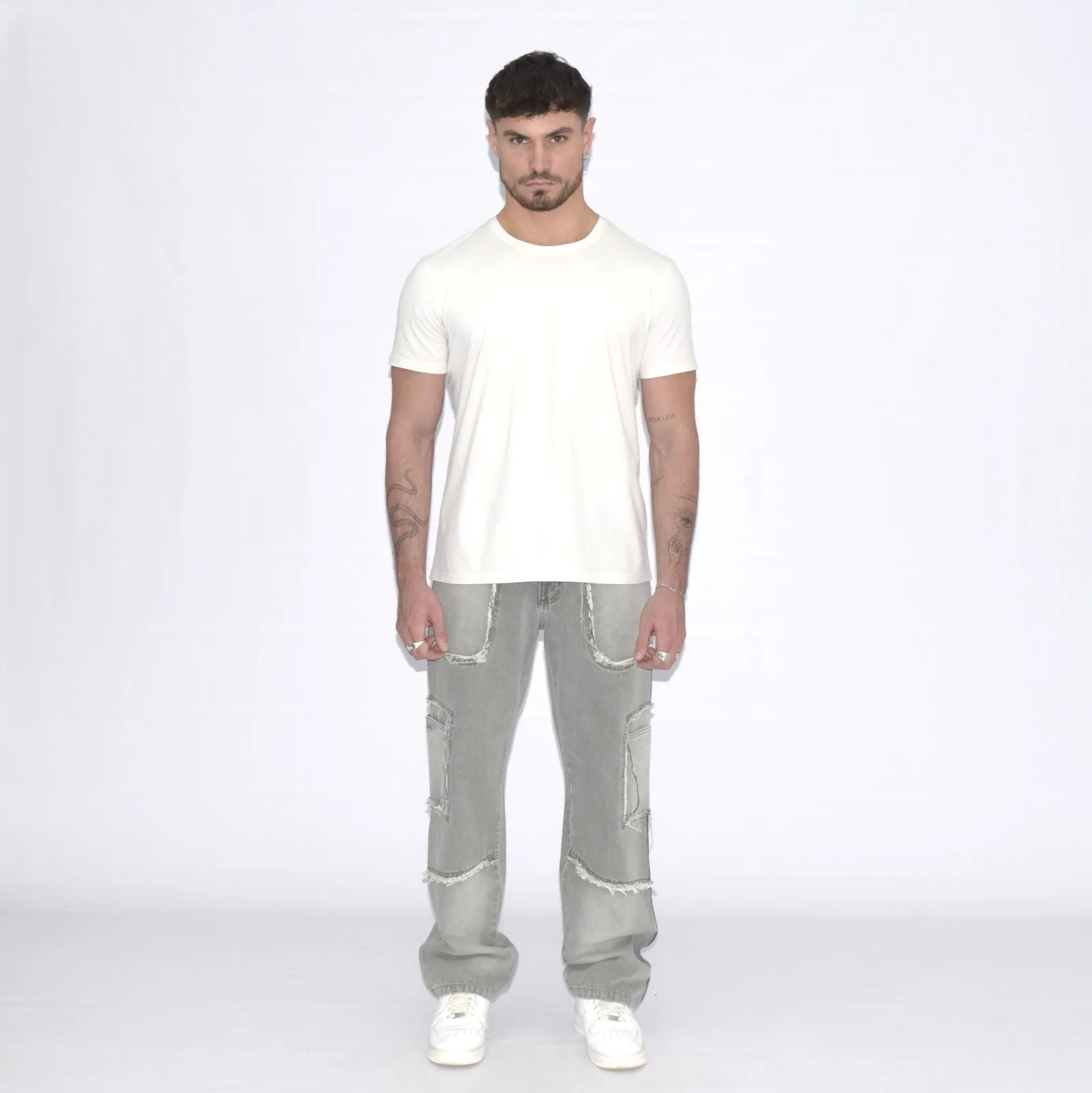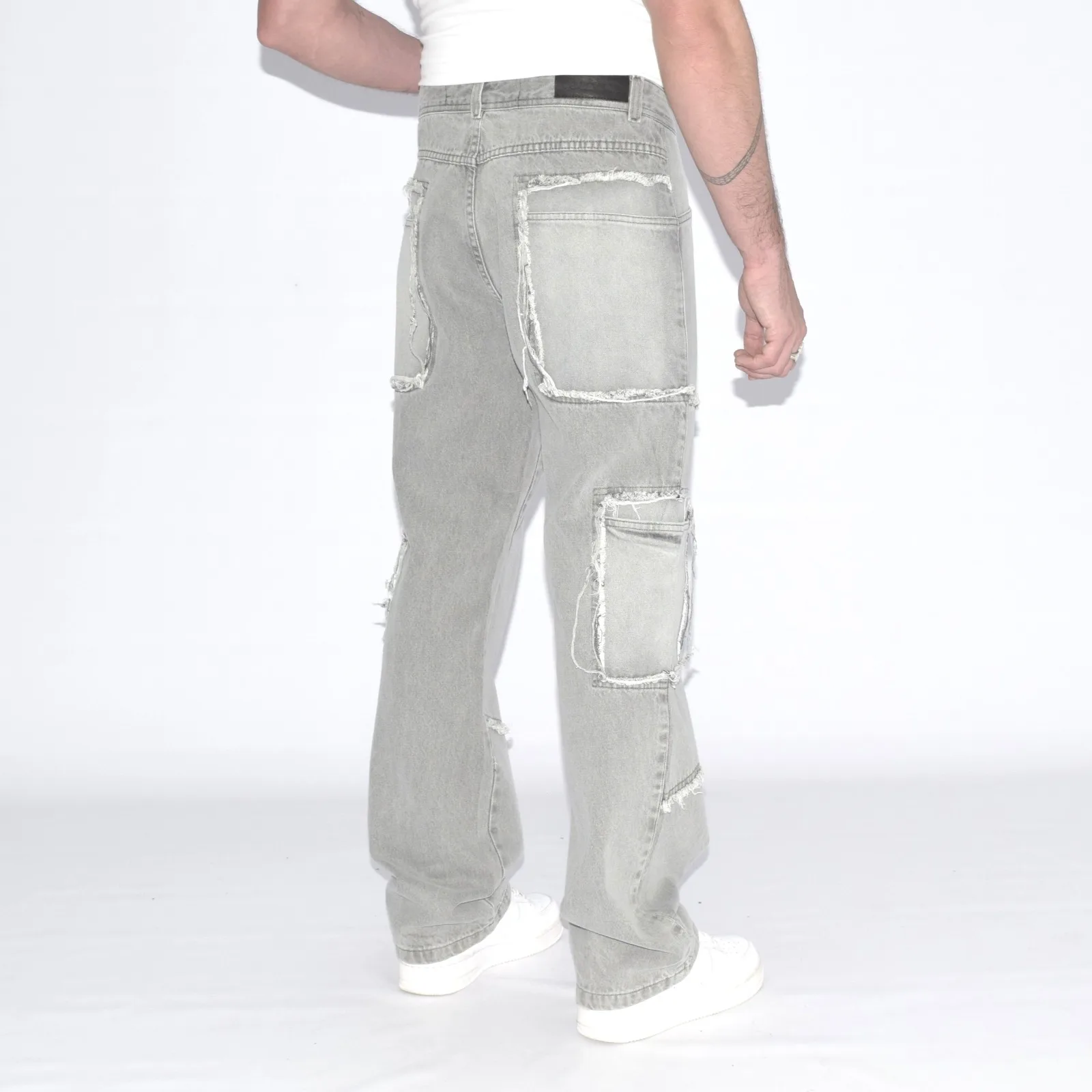 PANTALÓN DENIM RECTO CON FLECOS Y RECORTES. 100% algodón | Rigido.